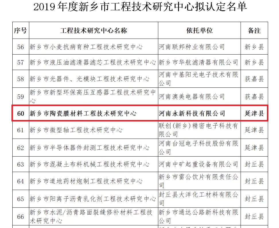 河南永新科技有限公司申報(bào)的“新鄉(xiāng)市陶瓷膜材料工程技術(shù)研究中心”順利通過評(píng)審,這不僅是新鄉(xiāng)市科學(xué)技術(shù)局對(duì)我公司一直以來堅(jiān)持科技成果轉(zhuǎn)化、知識(shí)產(chǎn)權(quán)自主保護(hù)等方面所做出努力的肯定,也充分證明了始終堅(jiān)持以技術(shù)創(chuàng)新為內(nèi)生產(chǎn)力是符合公司戰(zhàn)略要求的。